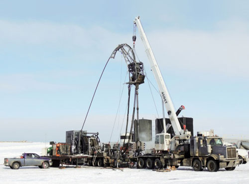 圖為由杰瑞制造的中國(guó)最大管徑連續(xù)油管設(shè)備在加拿大作業(yè)現(xiàn)場(chǎng)