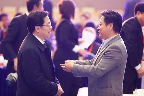 中石油裝備制造公司總經理張晗亮(左)與中石化石油工程機械有限公司總經理謝永金(右)親切交談