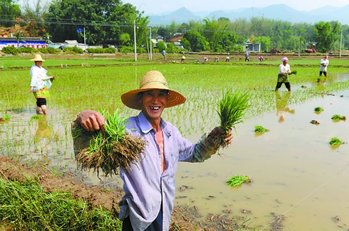 傣族村民刀大爺興奮地舉起秧苗,笑著說:“今年肯定是一個豐收年。”