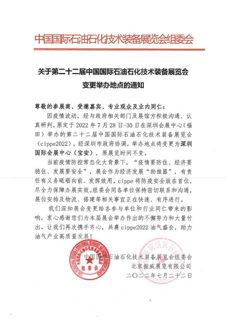 2022-07-252022年7月28日-30日,一年一度的世界石油天然氣大會——第二十二屆中國國際石油石化技術裝備展覽會(cippe2022振威國際石油展 )將在深圳會展 中心(福田)舉辦。河南中原特鋼裝備制造有限公司將亮相展會,展位號: E3006。歡迎您屆時 蒞臨企業展臺參觀交流。河南中原特鋼裝備制造有限公司.........【詳情】